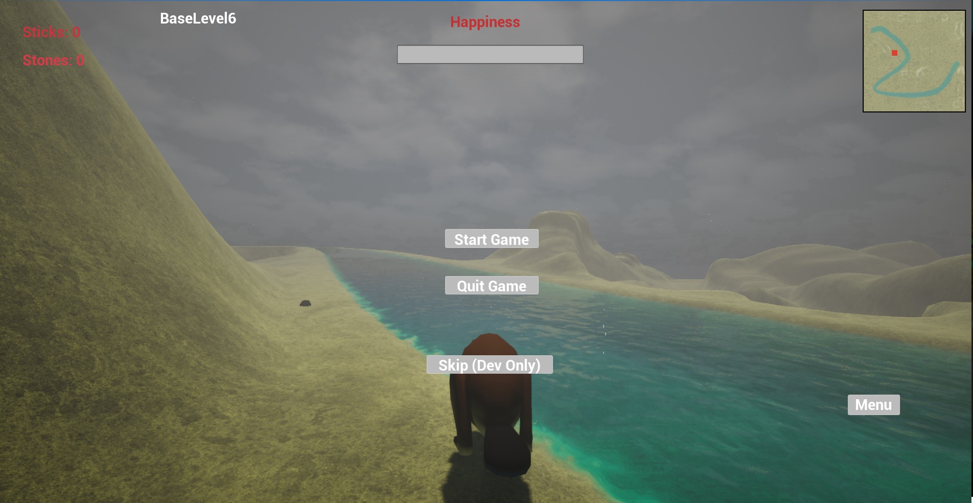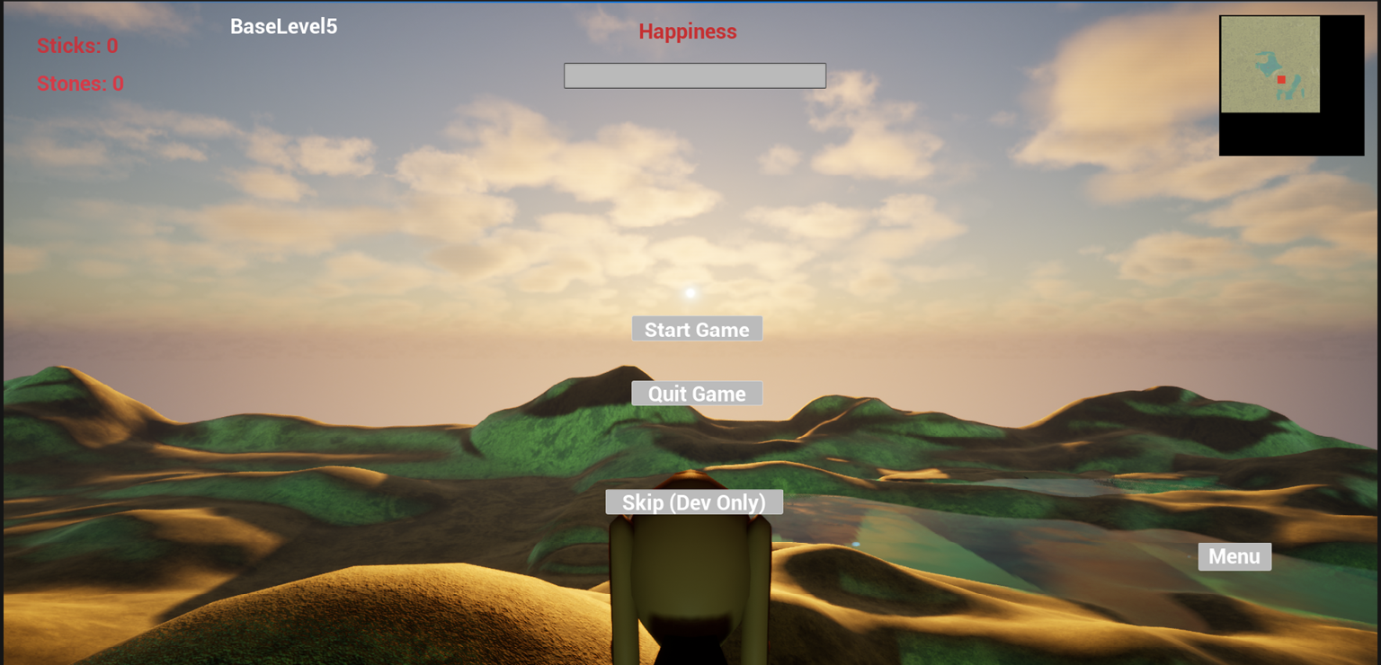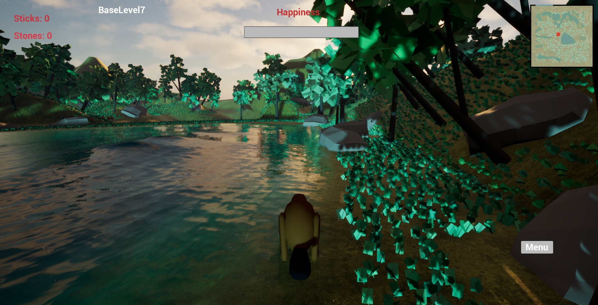 If it's a collecting game. Leading the player through the environment with a trail of resources, maybe even some platforming would be fun. And faster and smoother movement would help. If it's more about survival, I feel like adding some kind of obstacle would help, like you have to succeed in damming up the mouth of a river before it rains, or before the sun goes down. Otherwise it seems like you can wander aimlessly looking for sticks for a very long time with no real obstacle besides happiness slowly sinking. Apologies if something like these suggestions actually happens in a later level I wasn't able to get to.