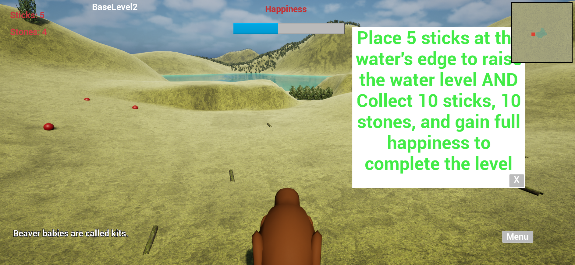 If you are reading this and you know a good resource for free 3D stuff like grasses and bushes and trees, please let me know. My budget for this game is currently $0. At some point I may buy a full 3D beaver with skeleton, but I can't/won't right now. I'm also very new at importing stuff and making it work, just as I'm a complete noob at Blender. I'm not an "artsy" person so that stuff will come slower than new game functionality.